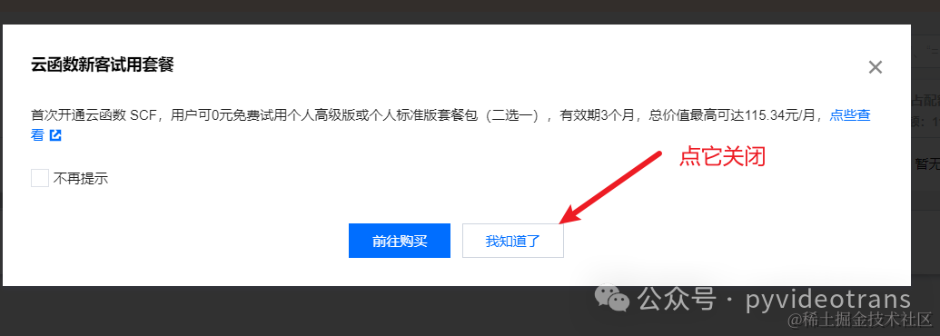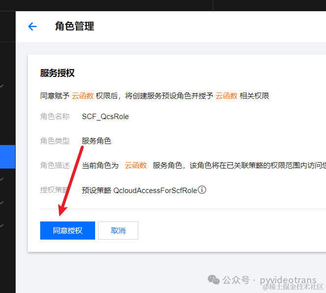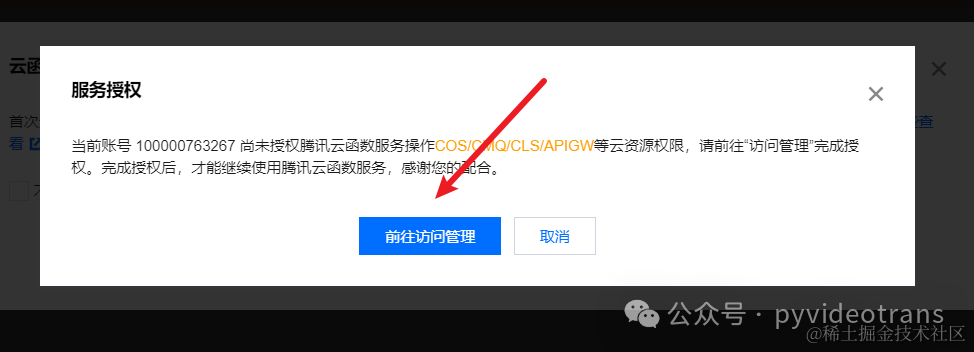 登录后,点击这个地址 https://console.cloud.tencent.com/scf/list ,进入云函数控制台,如果你是第一次使用,可能会弹出如下界面,单击蓝色按钮前往授权