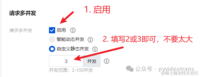 继续下拉, 找到请求多并发区域,如果折叠了,点击展开,然后选中“启用”,“自定义静态并发”填写为2或3就够用了。