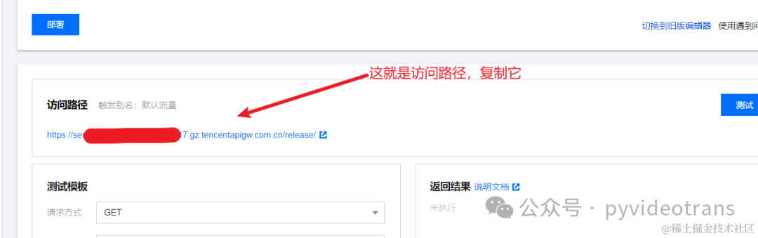 复制这个访问路径到剪贴板,然后将这个访问路径最后的 /release/ 修改为 /translate,比如我的访问路径是https://xxxxxx-xxx9515617.gz.tencentapigw.com.cn/release/,我修改后的新访问路径就是 https://xxxxxx-xxx9515617.gz.tencentapigw.com.cn/translate.