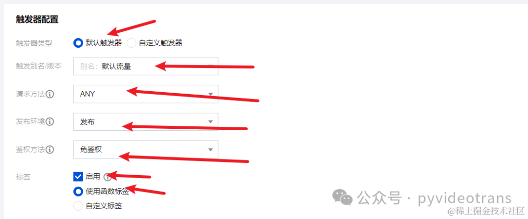 拉到底部找到触发器配置区域,选择“默认触发器”,别名为“默认流量”,请求方法“ANY”,发布环境为“发布”,“免鉴权”,标签选择“启用”,并选中“函数标签”,如下图。