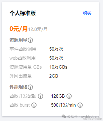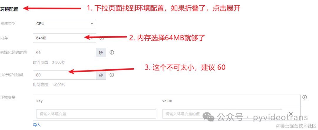 下拉页面,找到环境配置,内存选择“64MB”就足够了,选的越大你的免费额度就越快耗尽。执行超时时间填写“60”,不要太小,否则会频繁发生超时错误。其他默认。
