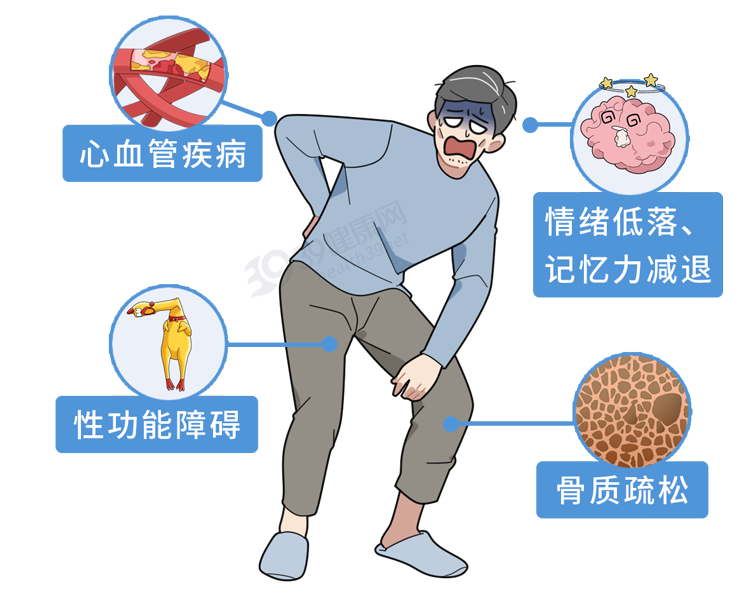 同时,男性到了中年,更要留意的是雄激素过低时带来的健康隐患: