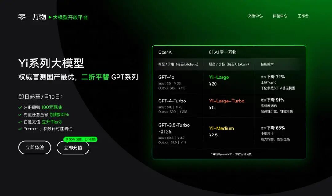 零一万物介绍,目前注册使用 Yi API 的新客户,零一万物立即赠送 100 元额度,帮助用户完成平稳过渡;平台充值还将赠送 50% 到账额度,上不封顶,为用户提供更长线的优惠;任意充值即可享受 RPM/TPM 限速直升 Tier3,直达高级别的服务质量和超快响应速度。此外,零一万物 API 还将提供 Prompt 兼容调优服务支持,陪伴用户又好又快地适配 Yi 系列大模型。