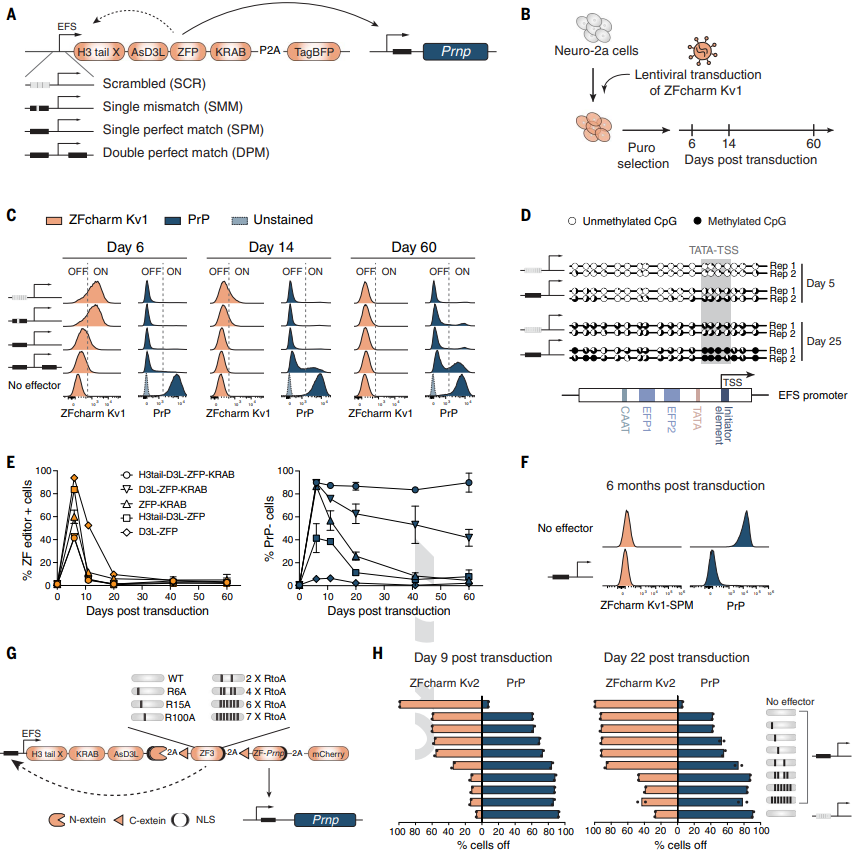 DNMT3A本身是无活性的,接下来研究团队还提出了在目标位点激活DNMT3A的巧妙策略。他们将DNMT3A的伴侣分子组合后连接到锌指蛋白上,而锌指蛋白会抵达目标PrP基因,因此内源性的DNMT3A就会在遇到目标基因时被激活,起到沉默基因的作用。