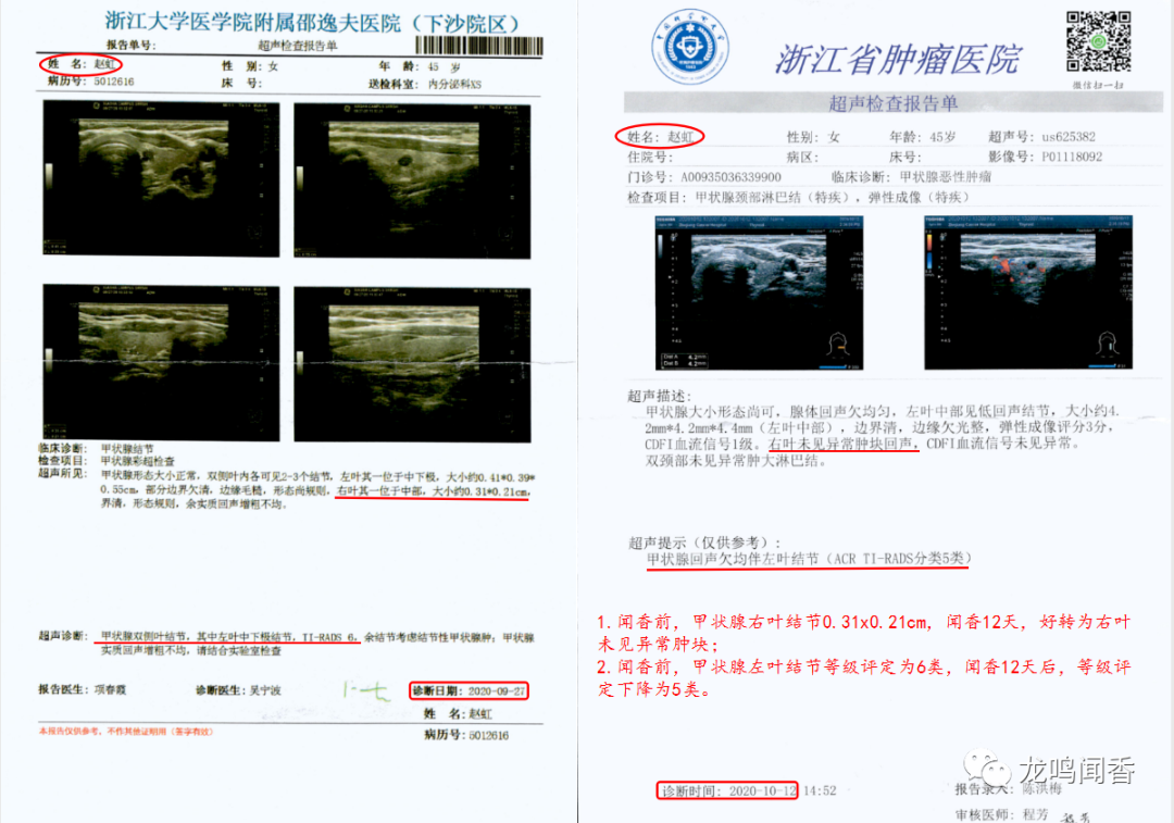 闻香十二天,赵虹去医院做了复查体检。她对这个结果压根儿没抱什么希望,因为时间太短了,不可能出现什么改观。但龙鸣闻香是一个能让人屡屡称奇的神器。复查后,医生举着影响结果告诉赵虹,“你先前左右双侧颈部各有两三个结节,这次复查「双侧一个结节都没有了」,只剩下肿瘤病灶。甲状腺结节的级别也「从六类降低为五类」。”