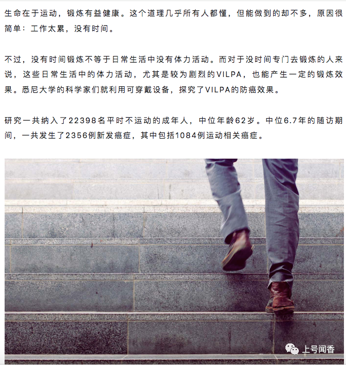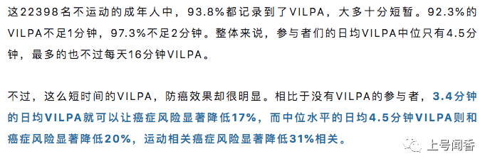 根据对22398名参与者中位6.7年的随访,平均每天3.4分钟的VILPA就可以让癌症风险明显下降。参与者的中位VILPA水平(每天4.5分钟)则与癌症风险降低20%,运动相关癌症风险降低31%相关。