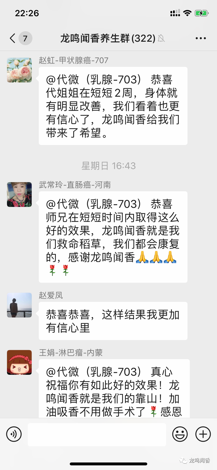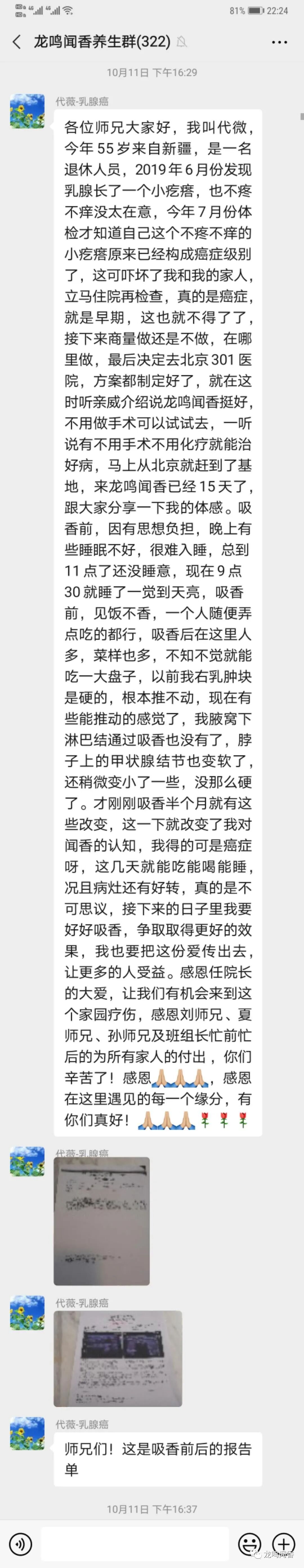 迄今为止,据不完全统计,龙鸣闻香已经成功救助上百位癌症患者康复,还有不计其数的被严重失眠、乳腺结节、飞蚊症、免疫力低下等亚健康人群获益匪浅。