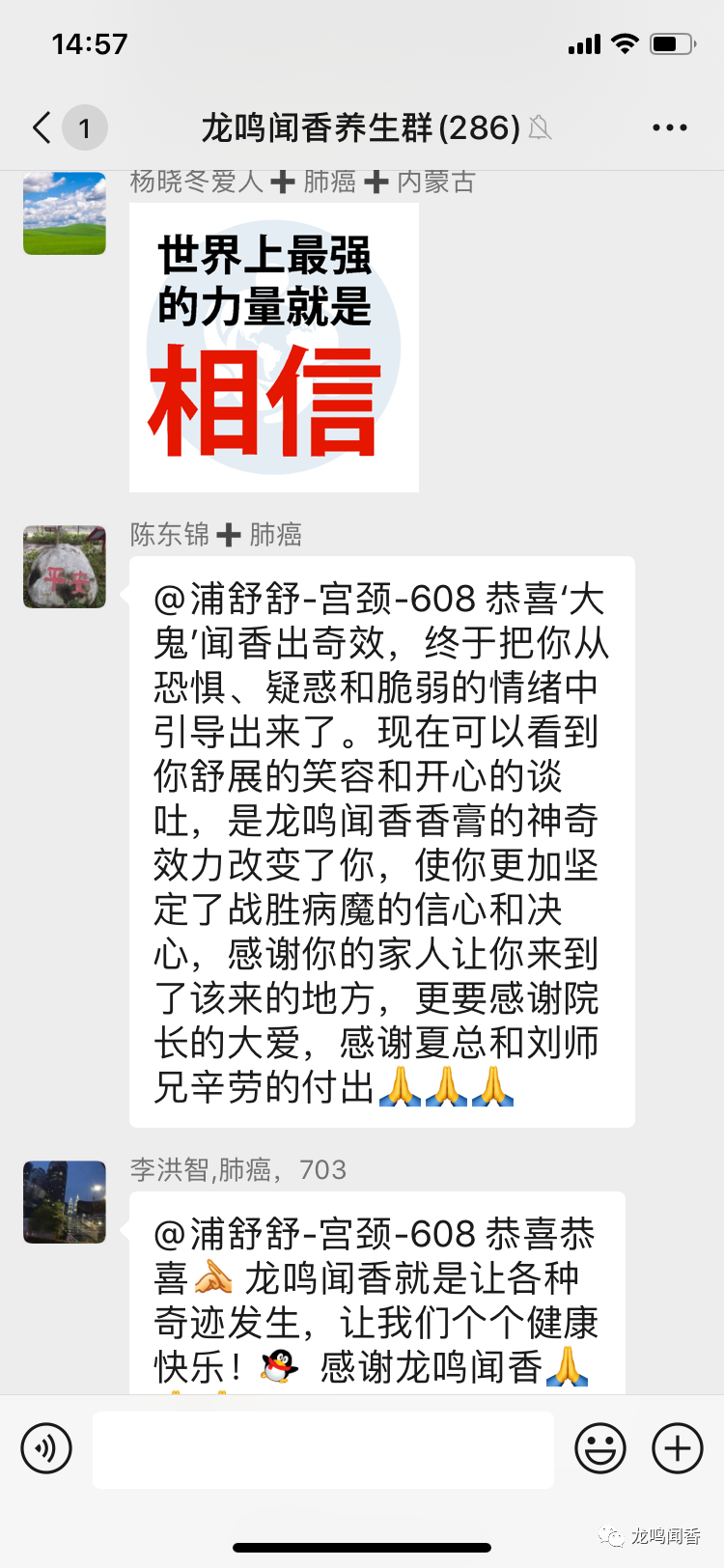 迄今为止,据不完全统计,龙鸣闻香已经成功救助上百位癌症患者康复,还有不计其数的被严重失眠、乳腺结节、飞蚊症、免疫力低下等亚健康人群获益匪浅。