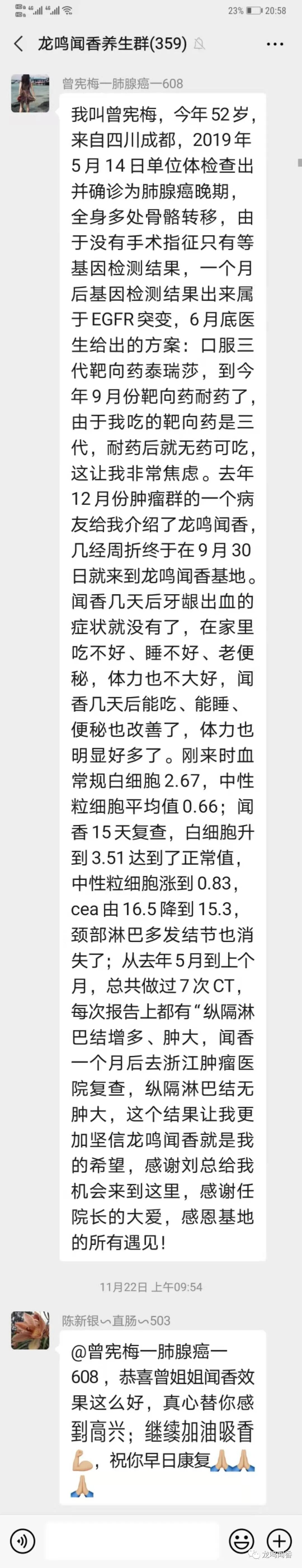 其实,曾宪梅本不敢有太多奢望,一方面是晚期肺腺癌,另一方面是基因突变,对三代靶向药产生耐药,她已经是无药可吃无医可治的地步了。但是来龙鸣闻香调理的一个月里,她不断收获从体感到肤色再到指标的全方位好转,龙鸣闻香让她看到了希望,在千钧一发之际,成功将危急的病情抑制住了。