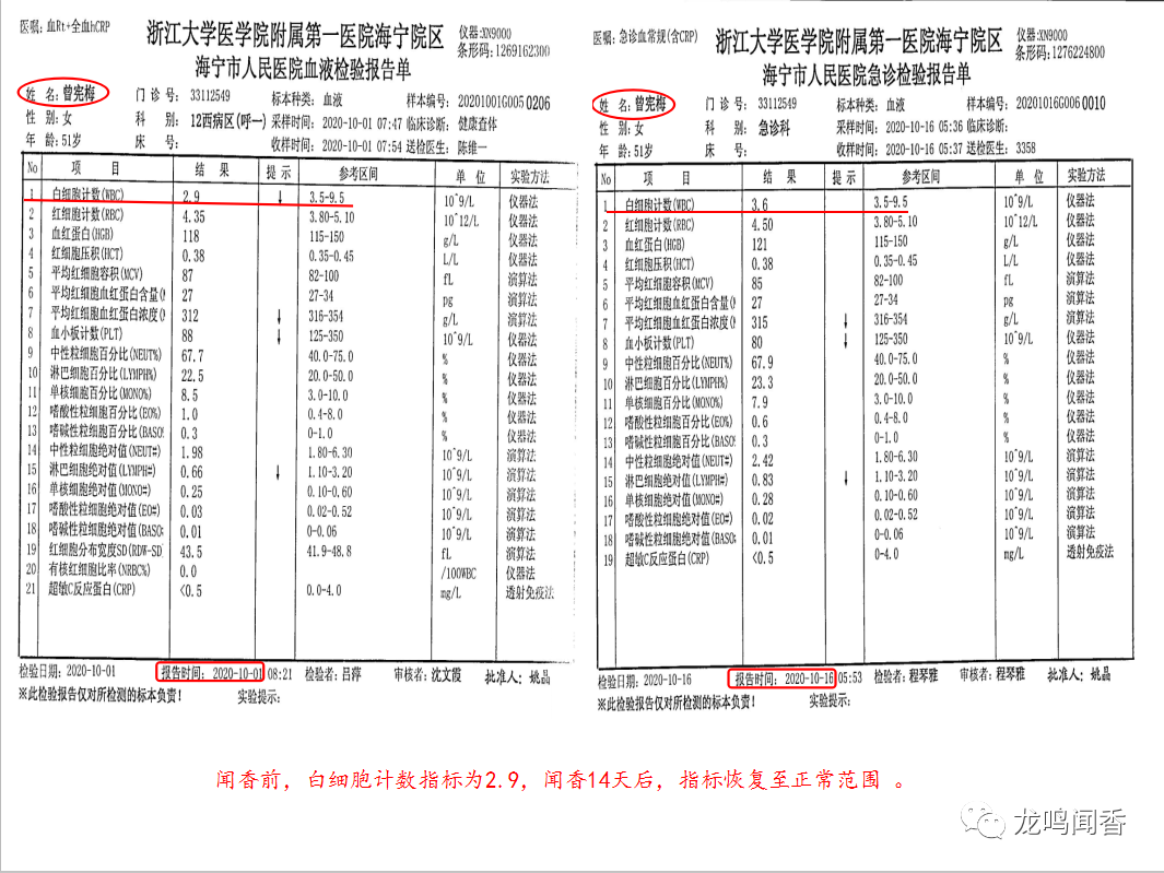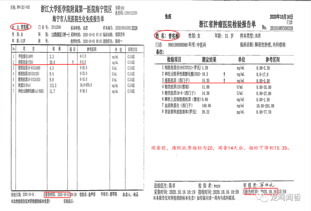体感和检验结果是龙鸣闻香效果的体现。90%以上的朋友在闻香调理中,很快会体现出体感的改善,如:睡眠、食欲、体力等。其次,是血液、CT等指标,闻香前后也会出现一定对比。认真闻香,认真记录闻香点滴的感受和变化,闻香明星的今天就是我们的明天。与此同时,我们必须明确一点,肿瘤可能耗费了十几年才生长出来,如果妄图通过闻香在15天之内就让肿瘤彻底消失,是不可能的。不要焦虑,给自己和龙鸣闻香足够的信心,踏踏实实做好每天该做的事,相信假以时日,美好的效果会不期而遇。 另外,闻香时会出现一定的调理反应,不必紧张,这是调理的必经之路,数日后就会出现好转,好转后身体状态又会呈螺旋式上升。