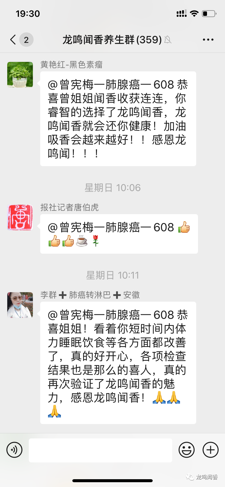 迄今为止,据不完全统计,龙鸣闻香已经成功救助上百位癌症患者康复,还有不计其数的被严重失眠、乳腺结节、飞蚊症、免疫力低下等亚健康人群获益匪浅。