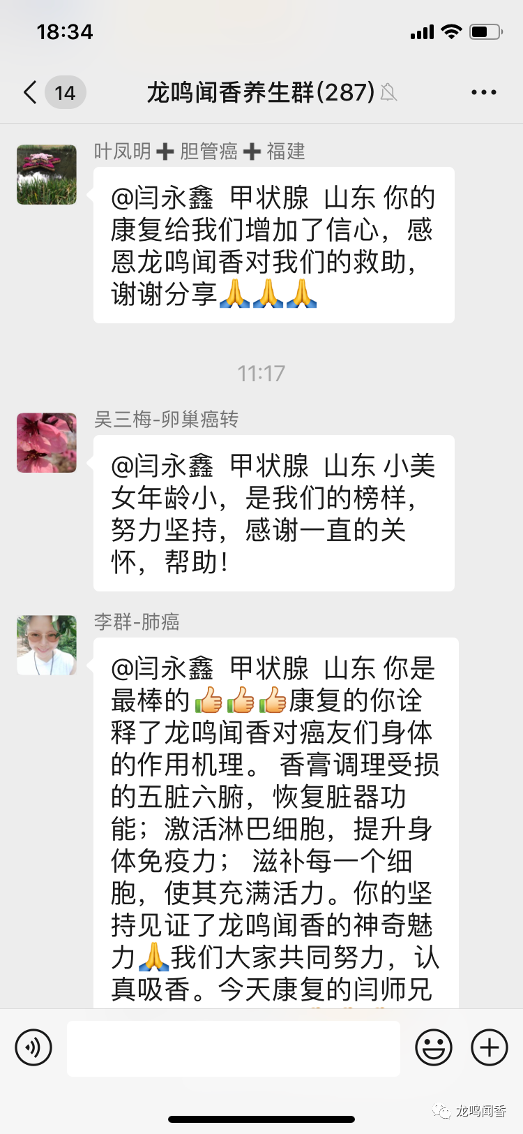 闻香第一天,我的甲状腺部位就有刺痛感,面部皮肤感觉很光滑,感觉香膏的小分子到达了病灶部位,开始全身进行排毒了。