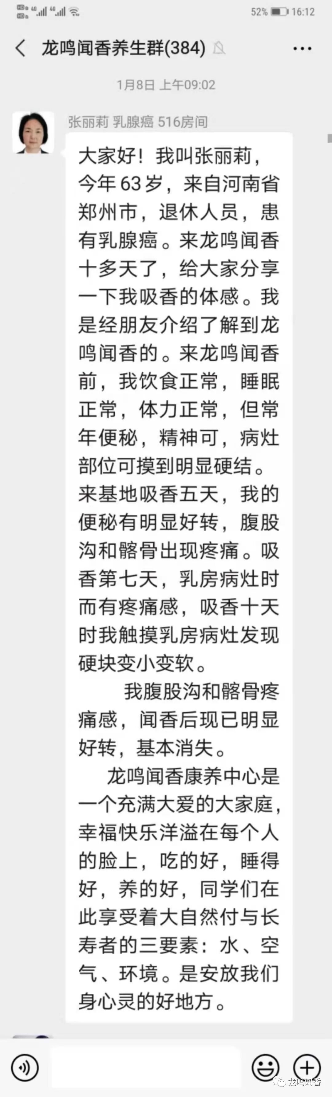 冥冥之中,张丽莉始终觉得有一线希望,自己肯定能找到办法战胜癌症。皇天不负有心人,张丽莉的朋友向她介绍了龙鸣闻香,熟人在龙鸣闻香调理效果非常好,而且很多癌症病号在这里都好转了。张丽莉和爱人认为,龙鸣闻香的闻香汗蒸方式,既能够有效抗癌,又能够避免创伤和副作用,他们没有等门诊报告出来,就马上办理出院,赶往梦寐以求的龙鸣闻香。