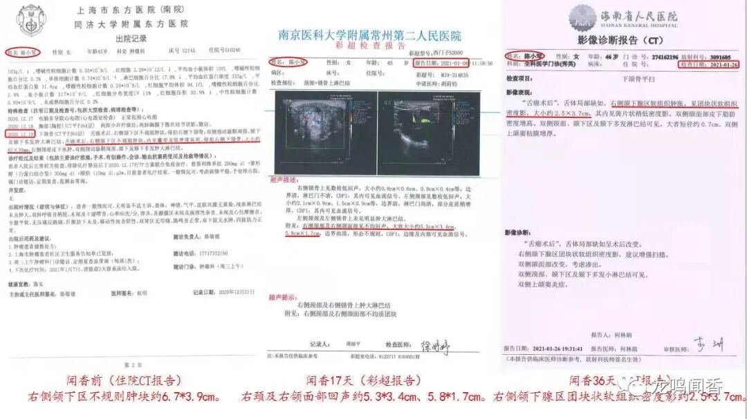 第一天闻香调理,陈小琴的病灶疼痛大为减轻,她告别了止疼药。持续调理之下,她的睡眠、体力、痛感、下颌骨肿胀都不断出现好转。经过阶段性闻香调理及复查,彩超报告对比显示,她的右下颌占位的确在大幅缩小好转。