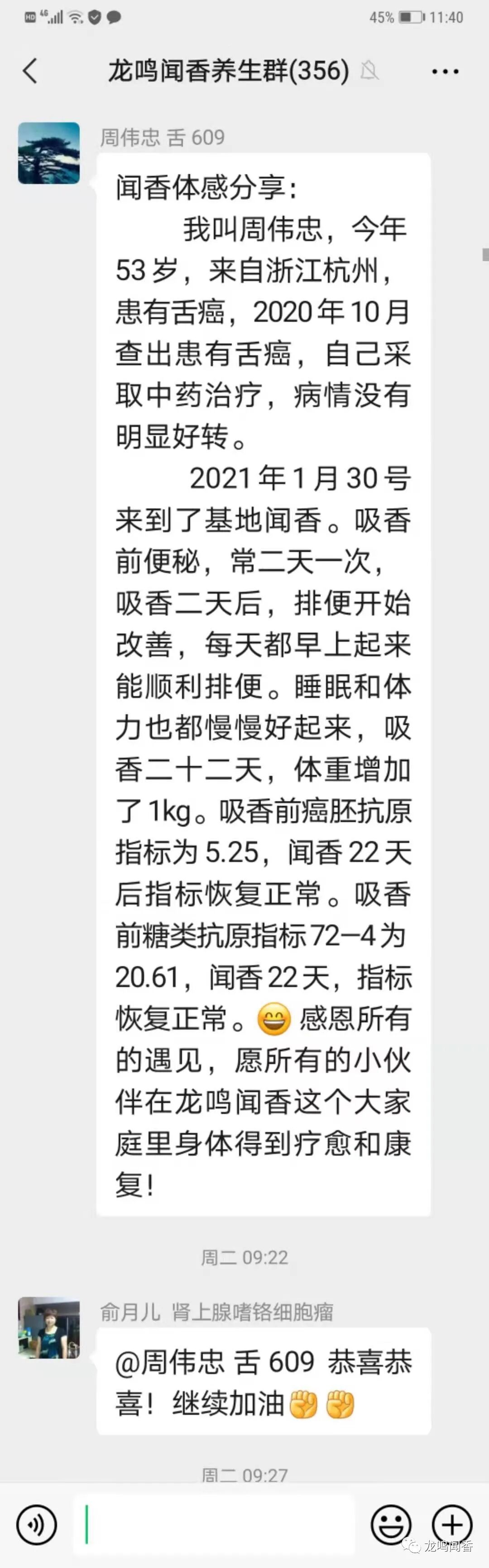 但当时,周伟忠被裹足不前的针灸和汤药搞的垂头丧气,对龙鸣闻香也提不起信心。当妻子耐心地把陈小琴的分享放给周伟忠反复观看后,看到陈小琴从体感、病灶、指标、心态方方面面都越来越好,周伟忠才同意来康养中心试试。