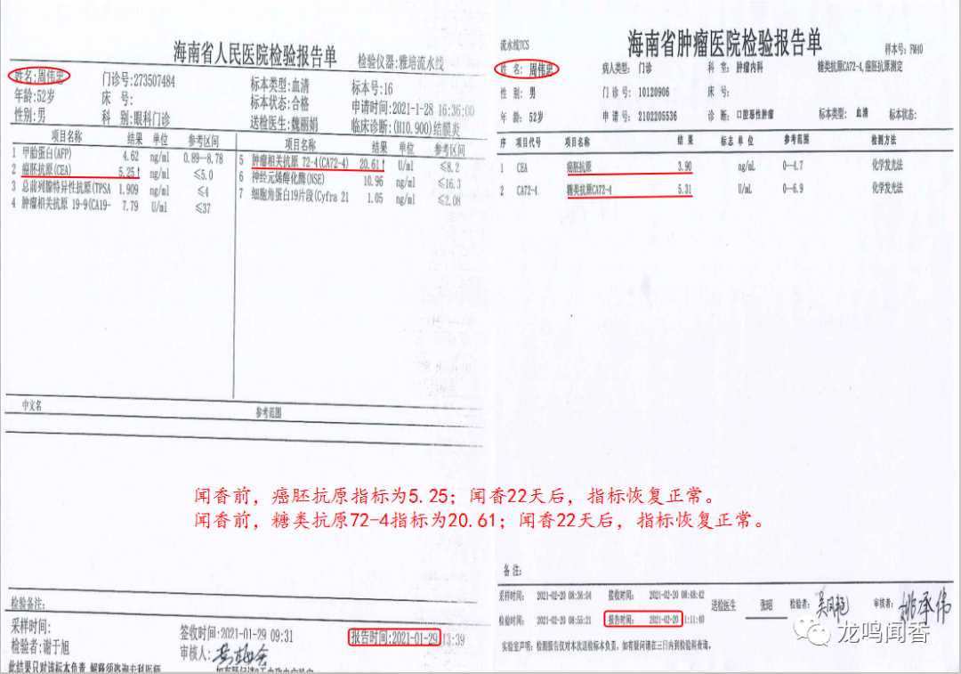 闻香前,癌胚抗原指标为5.25;闻香22天后,指标恢复正常。