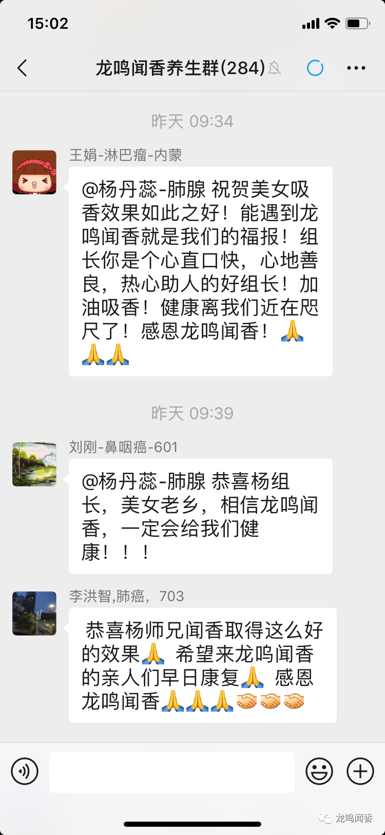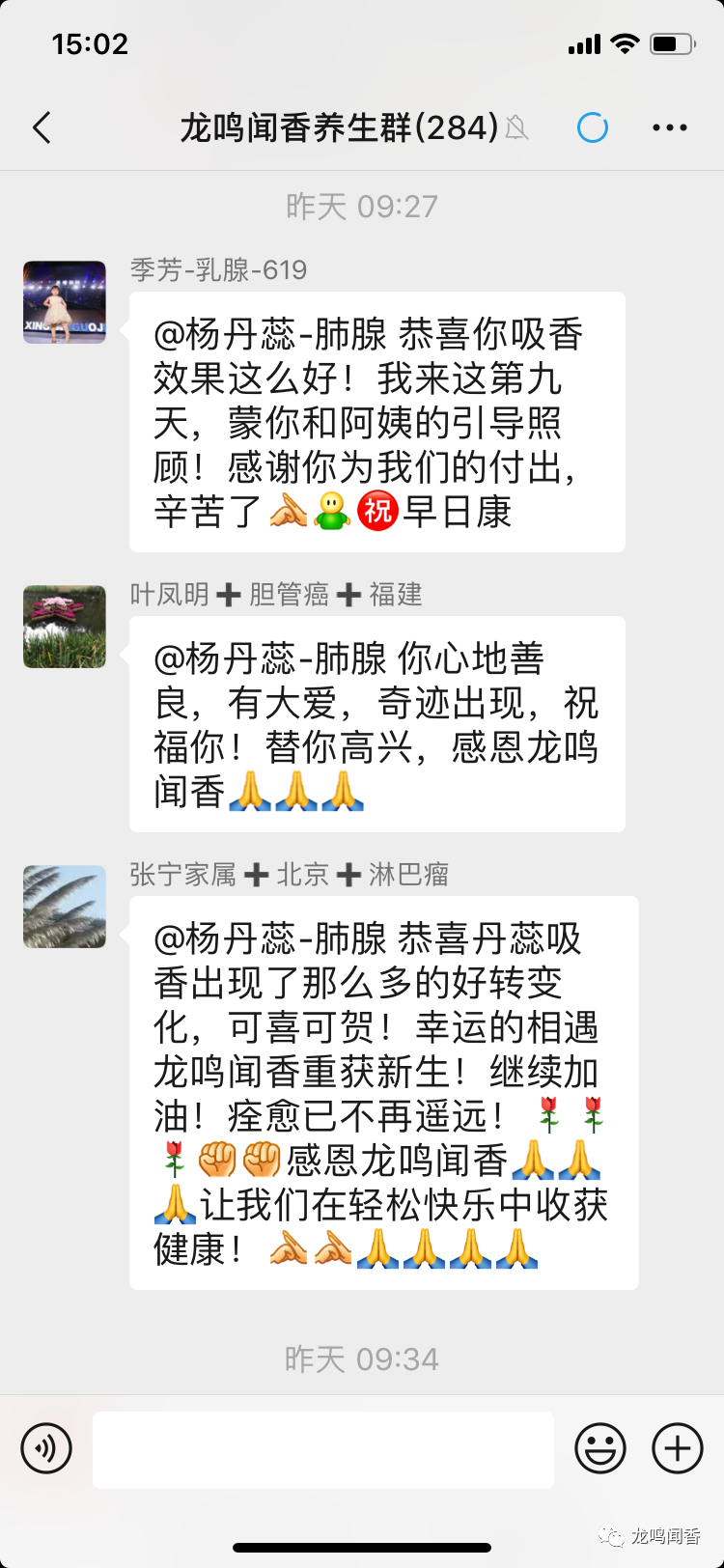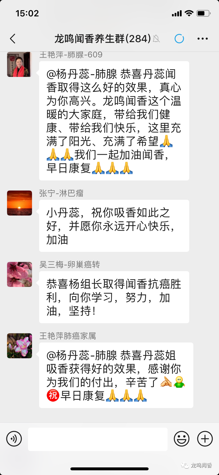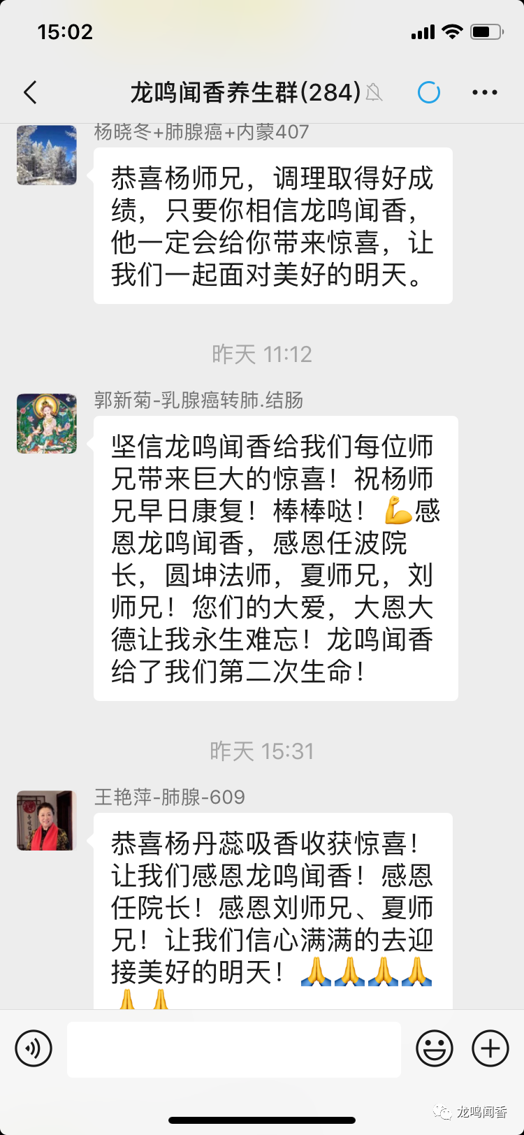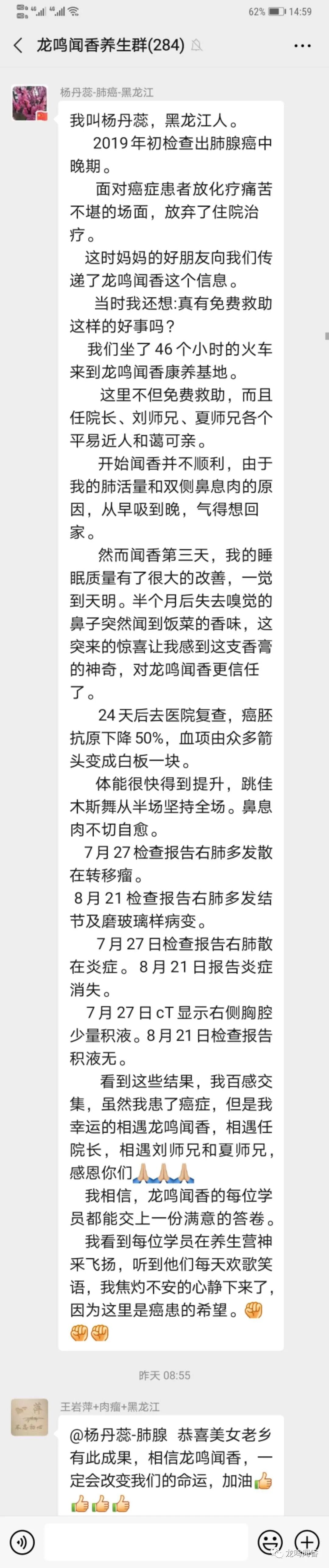 迄今为止,据不完全统计,龙鸣闻香已经成功救助上百位癌症患者康复,还有不计其数的被严重失眠、乳腺结节、飞蚊症、免疫力低下等亚健康人群获益匪浅。