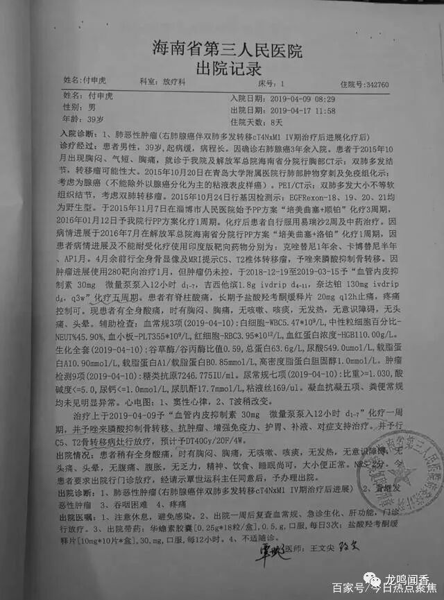 与网络暴力同样可怕的,是悄无声息吞噬生命的癌症。虎子的去世令人惋惜,生前遭受过病魔的折磨令人动容,但与此同时,龙鸣闻香公益救助中,又涌现了一位同样被医生放弃的肺癌患者逆袭的案例。