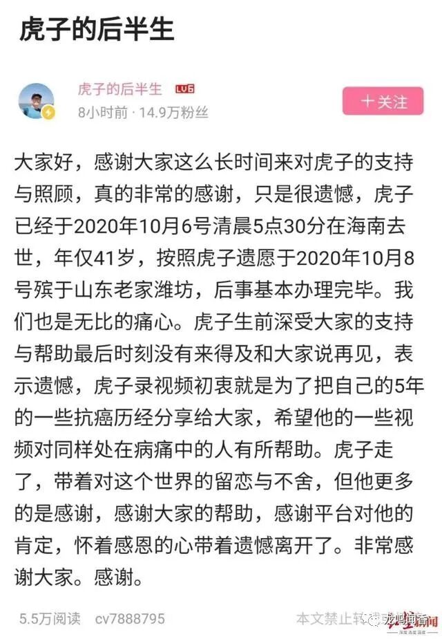 10月9日,颇具争议的抗癌博主“虎子的后半生”账号发布讣告称,虎子已经于2020年10月6号清晨5点30分在海南去世,年仅41岁。此前虎子曾连续发布视频记录抗癌生活,后被网友质疑花销巨大疑似卖惨。
