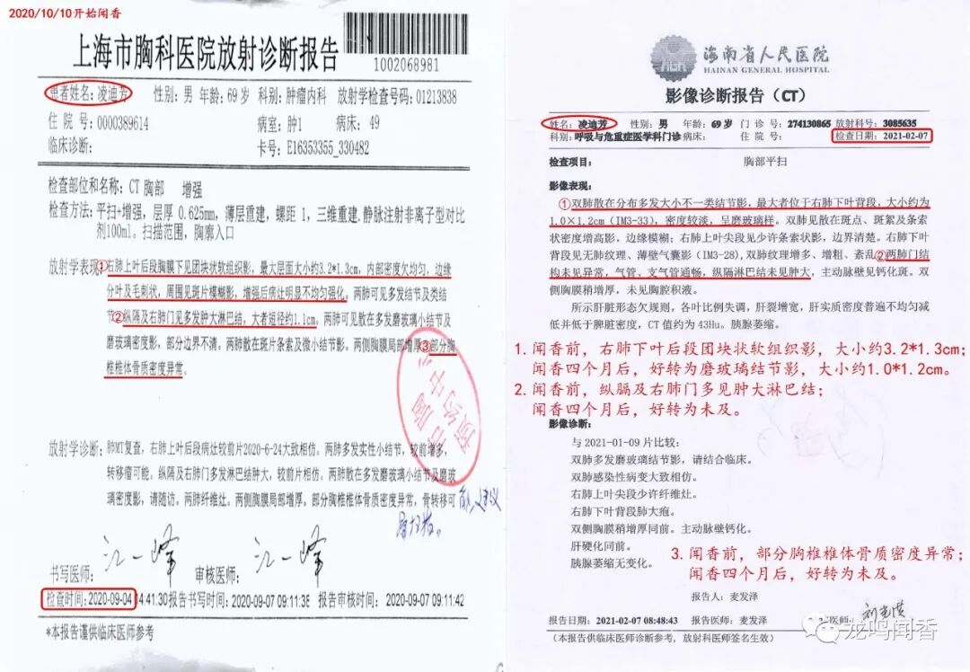 具体而言,经过将近五个月的闻香调理,凌迪芳的肿瘤标志物全部合格,这是所有癌症患者最为关注的板块,他取得了最好的效果。而且,肺部的小结节都没有了,这个好转也十分惊人。另外,原先的小肿瘤也没有了。老领导对此高度满意,决心在康养中心继续闻香调理,巩固效果,再创辉煌。