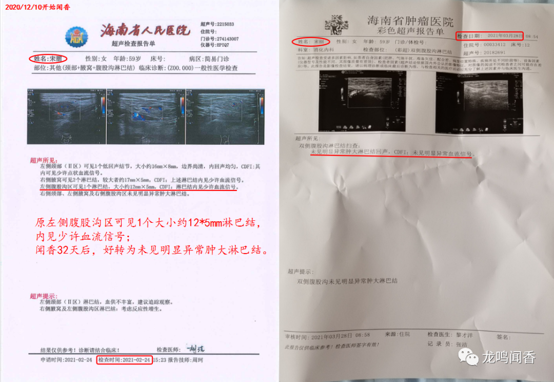 1.【腹股沟淋巴结】原左侧腹股沟区可见1个大小约12x5mm淋巴结,内见少许血流信号;闻香32天后,好转为未见明显异常肿大淋巴结。
