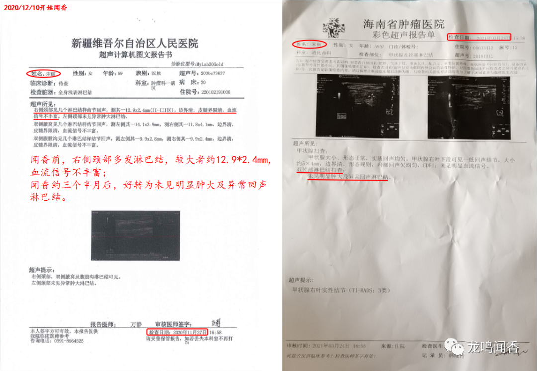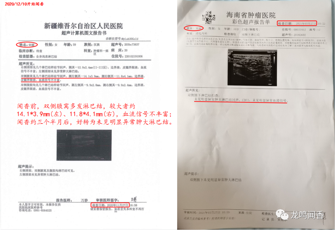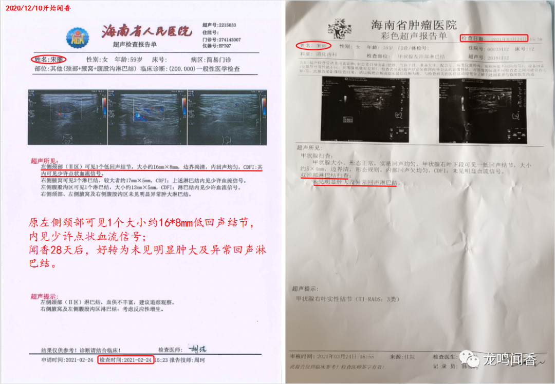 6.【颈部多发淋巴结】闻香前,右侧颈部多发淋巴结,较大者约12.9x2.4mm,血流信号不丰富;闻香约三个半月后,好转为未见明显肿大及异常回声淋巴结。