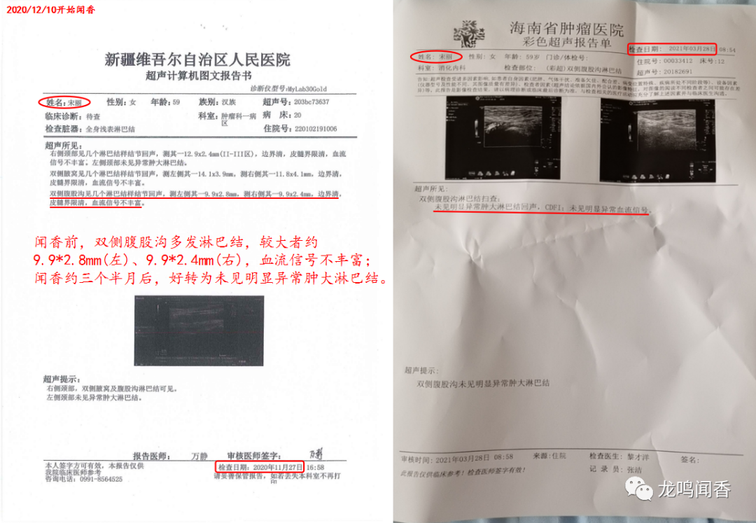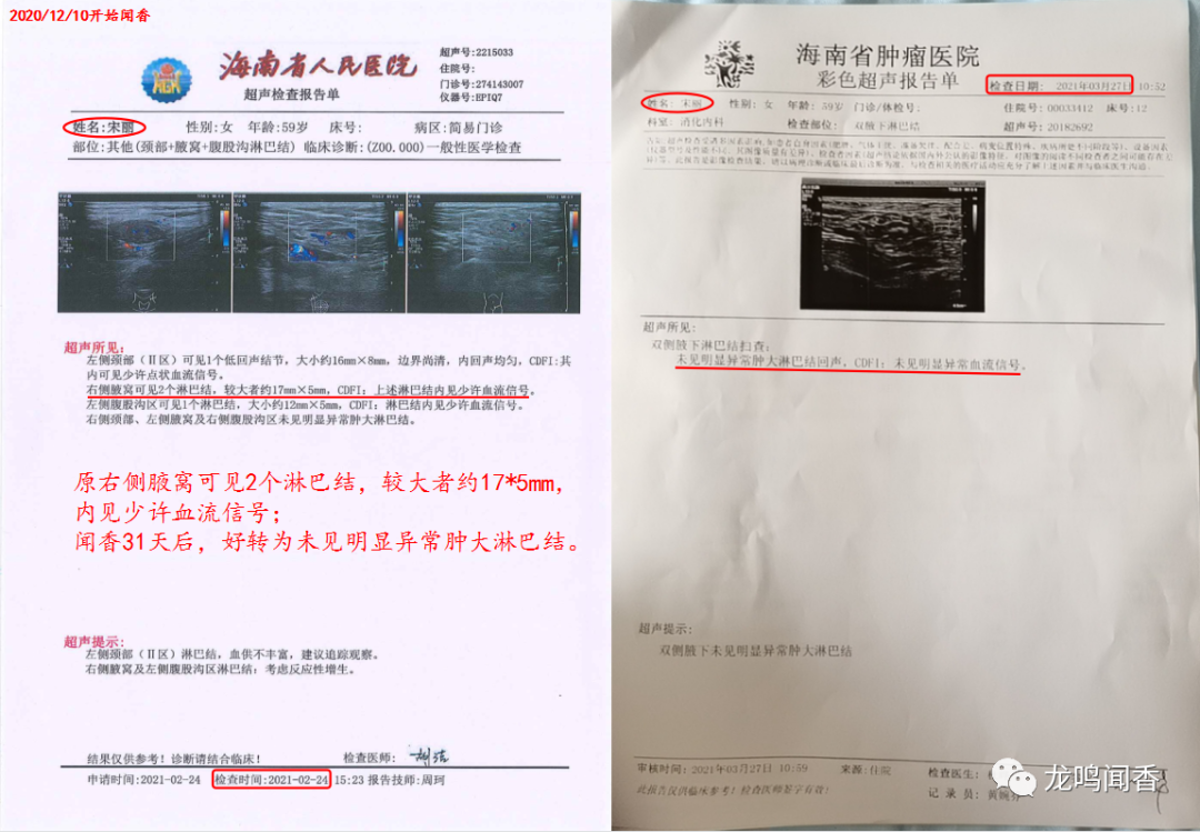 5.【腹股沟多发淋巴结】闻香前,双侧腹股沟多发淋巴结,较大者约9.9x2.8mm(左)、9.9x2.4mm(右),血流信号不丰富;闻香约三个半月后,好转为未见明显异常肿大淋巴结。