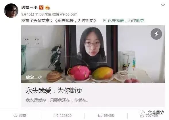 2018年9月15日,著名网络作家、中国作协主席团委员唐家三少在微博发布了长文,悼念因乳腺癌去世的妻子。“我永远爱你,只要我还在,你就在。”写不尽纸短情长,诉不完言浅情深,字字令人感叹。