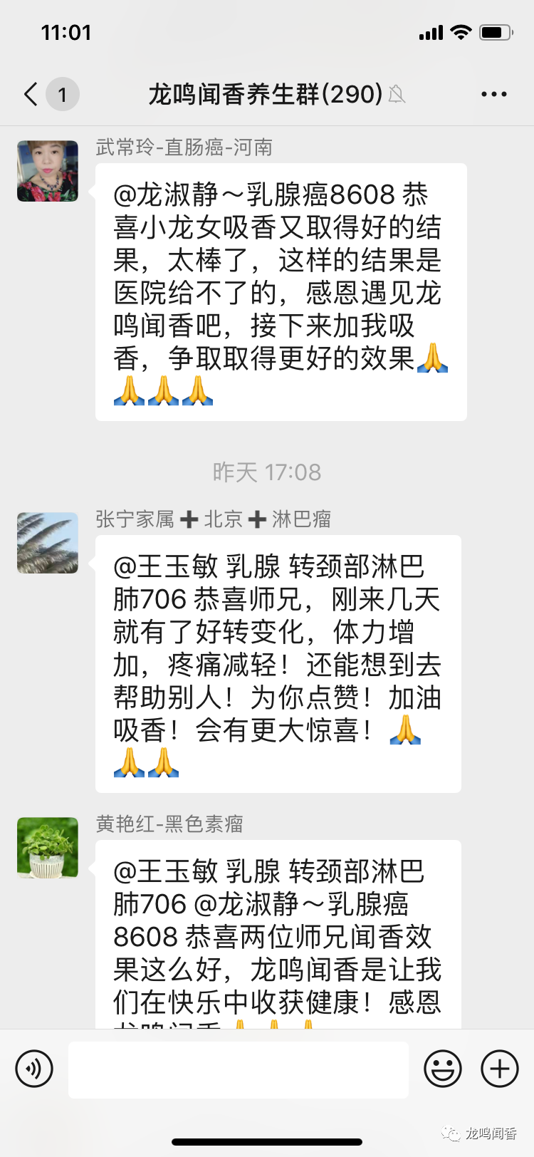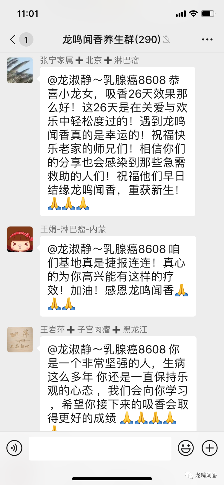 迄今为止,据不完全统计,龙鸣闻香已经成功救助上百位癌症患者康复,还有不计其数的被严重失眠、乳腺结节、飞蚊症、免疫力低下等亚健康人群获益匪浅。