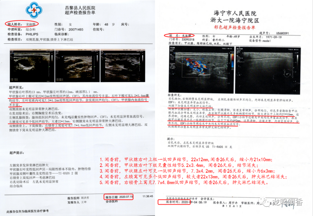 4.左腋窝的多个低回声结节,较大者达22*13mm,经闻香调理肿大淋巴结消失了;