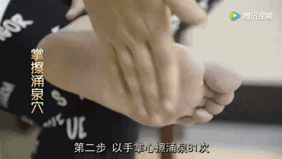 做法:热水洗脚后用左手掌心按摩右脚涌泉穴 60 次至发热,再以右手掌心按摩左脚涌泉穴 60 次至发热。