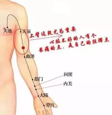 可以按整条经络,也可以按痛点那一段,心包经的阻滞点在上臂的心包经上。把天泉穴与曲泽穴之间分成三份,心包经的阻滞点就位于靠近曲泽的三分之一处。每个人略有差别,有的人偏上一点,有的偏下一点,具体以痛点为准。