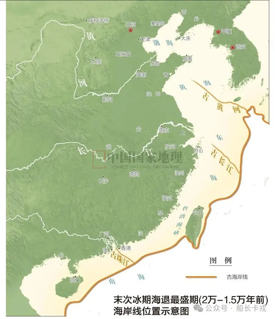 因为冰盖的迅速扩张,大量的水变成了冰川。从而导致全球的海平面平均下降了惊人的100米以上。如今汹涌澎湃的渤海、黄海和东海的大部分地区,在那时变成了一片广袤无垠的陆地。并且,现在的日本列岛和我国的台湾等岛屿,也与这片大陆紧密相连。在考古学上被称为‘三海平原’。