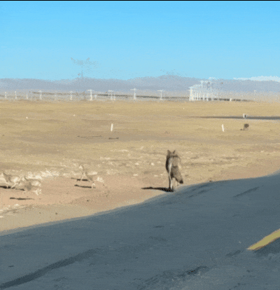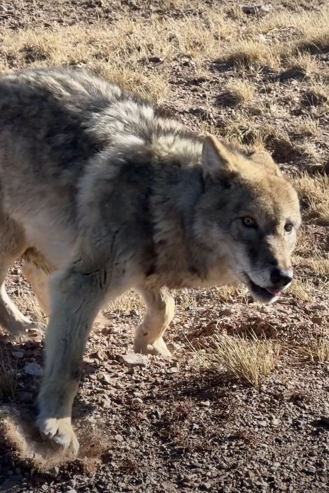 有网友拍到网红狼在路上追逐藏羚羊的样子。
