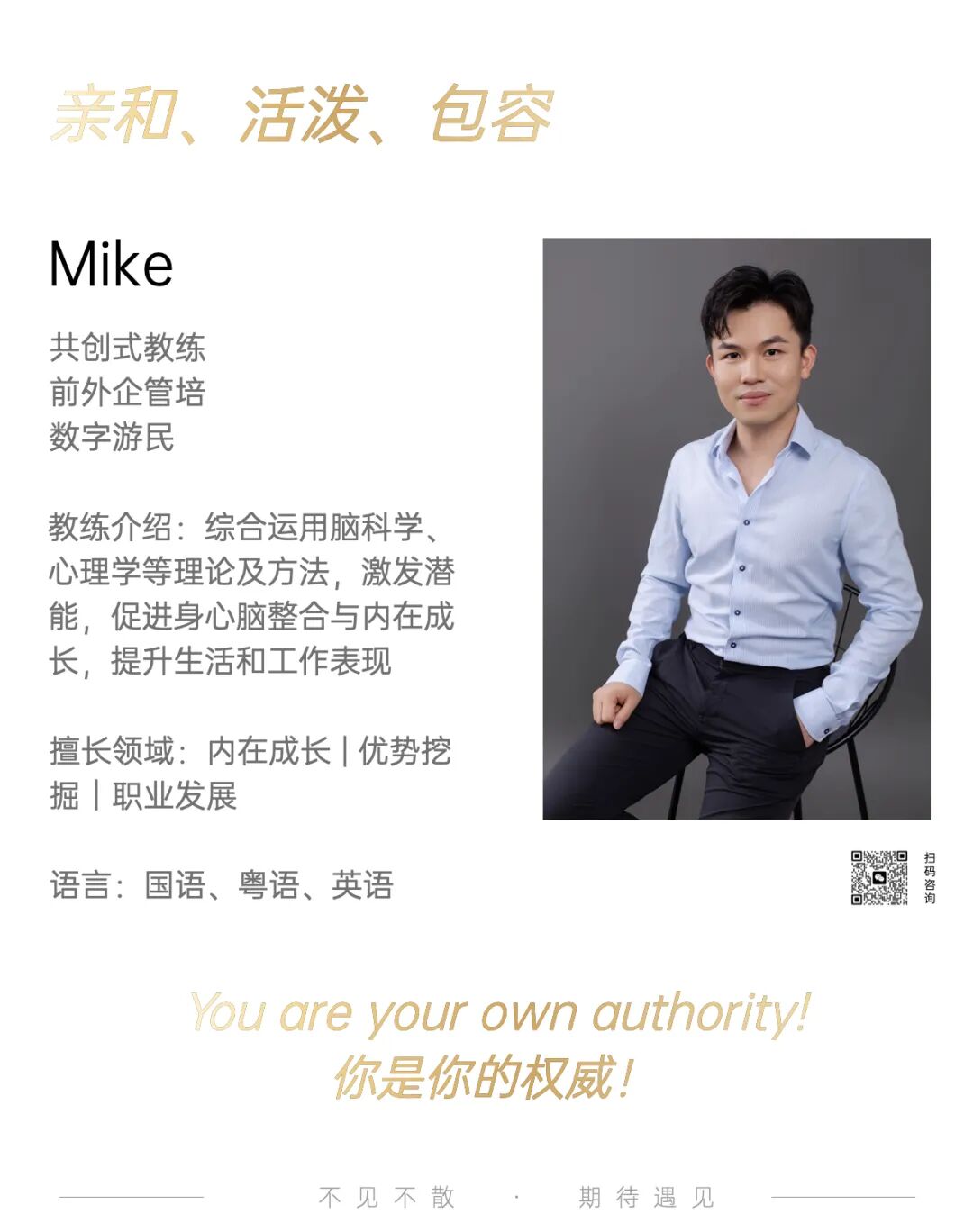 Mike很感恩这次禅修的体验,让他更清楚自己想要过什么样的生活:他未来希望通过自媒体给大家传递不一样的生活,让更多人看到生活的更多可能性;成为人生教练帮助曾经像他一样迷茫的年轻人,突破自己的舒适圈,找到自己的使命,做自己热爱的事情。勇敢地做自己。因为在做自己这件事上,没有人比你自己更擅长。