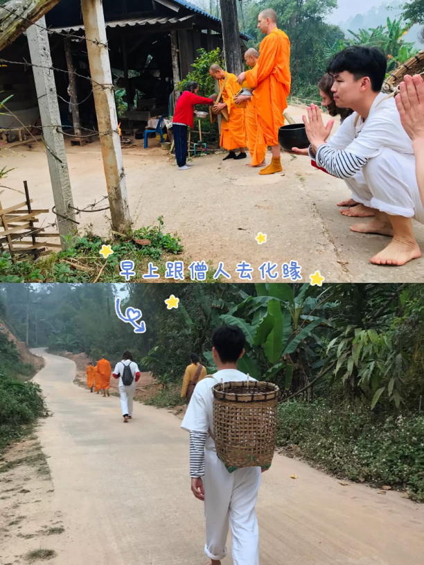 在泰国清迈生活的过程中,最让Mike有所触动的是参加冥想禅修经历。每天的生活简单而充盈。早上五点起床念经与冥想,之后跟师傅化缘;在大自然中进行冥想,例如瀑布边,森林里,篝火旁等。远离电子设备,重新把注意力放在自己身上;思考自己跟自己的关系,与大自然重新连接,感受它的美丽。