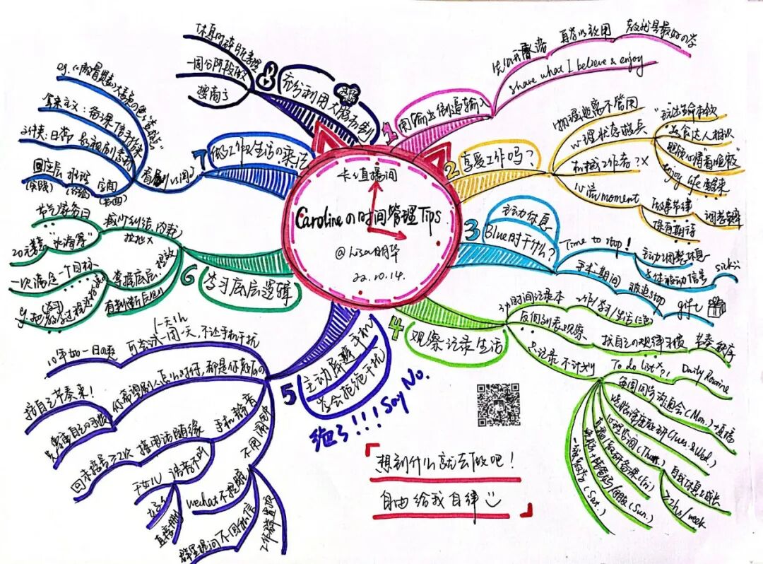 明华有很好的艺术基础,曾经中高考也都是美术和声乐特长生,她喜欢通过手绘思维导图的方式,把自己学到的知识和书籍进行复盘和输出。学习心理学等新知识时,得益于以前做同声传译的功底,她能做到“老师在上面讲,手在底下画,一堂课结束,思维导图也生成了”。