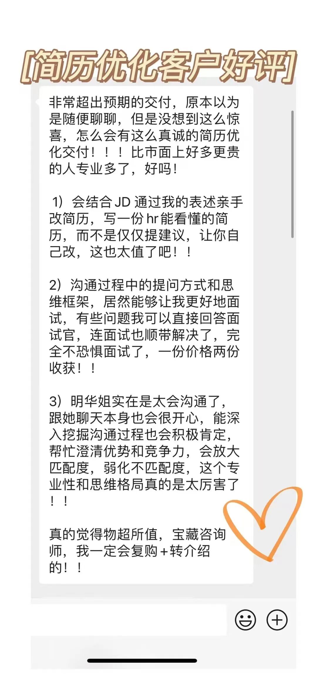 近半年时间,明华已成功服务了100+客户,里面有工作十多年、二十年以上的职场老手,也有初入职场1-5年的新人。无论是空白的青涩学生,还是有硕果累累的职场专家,她会通过耐心的深度对话以及专业判研,挖掘他们的个人优势价值,提供面试指导,为客户提供一份独属的“个人图景”与“闪亮名片”。
