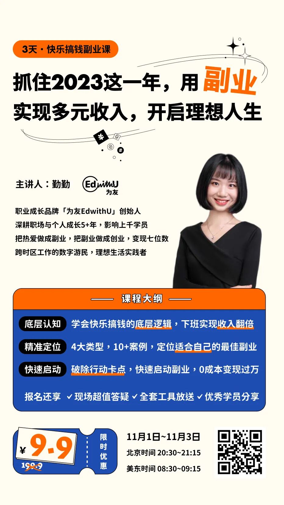 如果你想让自己的优势变现,实现财富自由。我们推出了副业营的体验版——【三天·快乐搞钱副业课】,把正课中的一部分,以公益的价格开放给感兴趣的伙伴们。