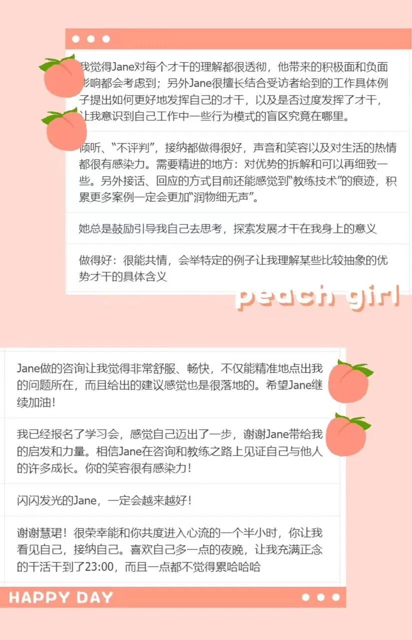 Jane将自己已完成的和未来的愿景总结为:帮助和曾经的她一样,陷入迷茫、困惑、痛苦的伙伴们,看见这些负面情绪背后真实的自我需求,打破认知的局限,激发自己的优势潜能,去创造人生的无限可能——
