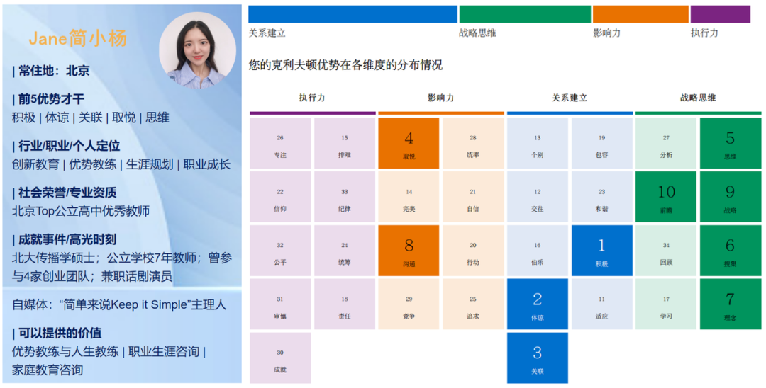 她始学习优势教练,去了解自己的才干是如何被压抑、被满足,看见自己的卡点和盲点,她就看见了自己的独一无二。