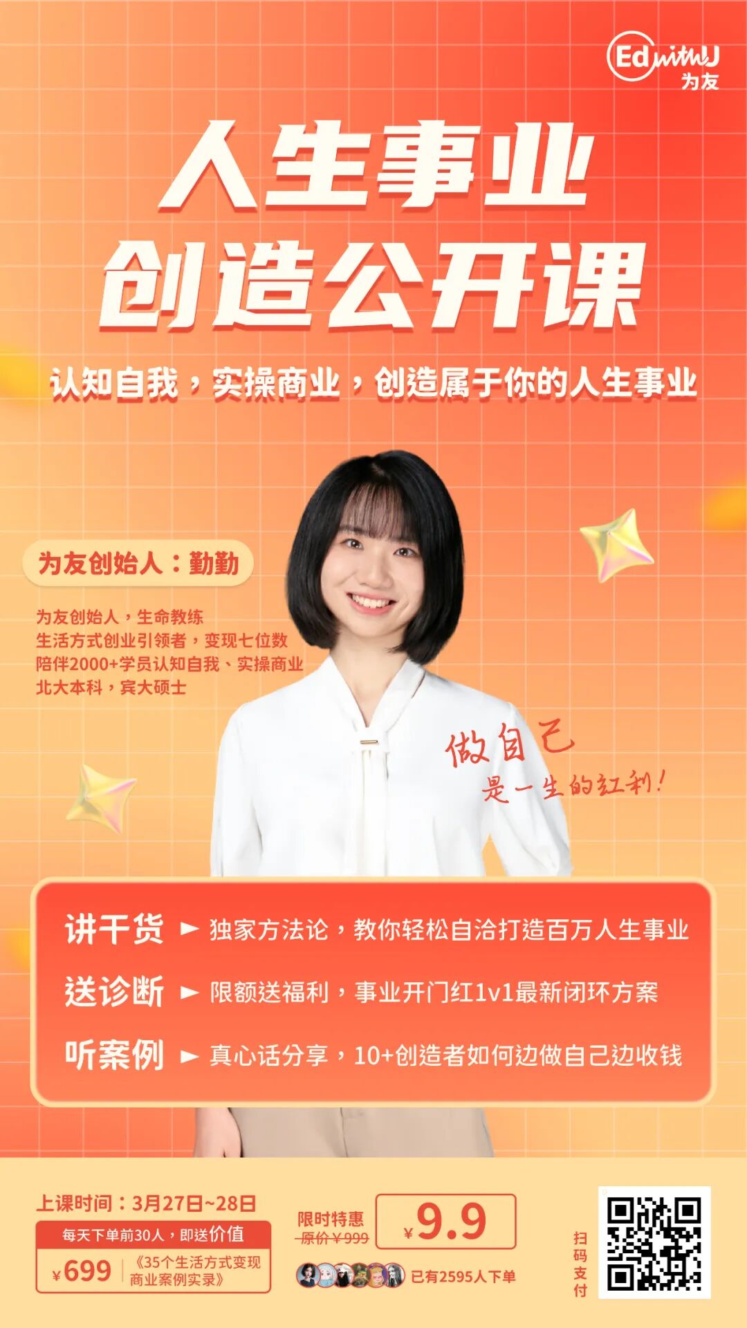 别忘了预约3月16日的为友直播,勤勤将对话后厂女王小王,聊一聊“如何让自己的人生总有好事发生”这件事。