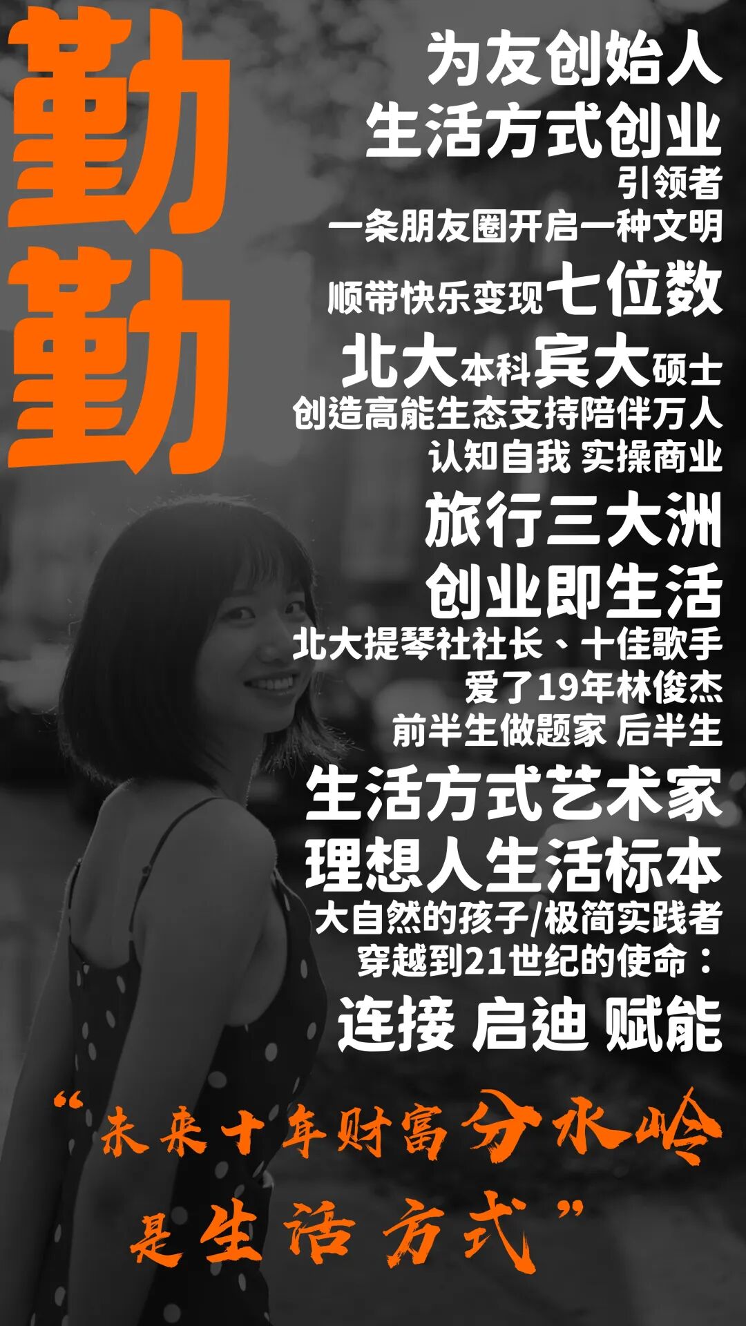 作为为友创始人、“生活方式创业”引领者,勤勤在为友课程、朋友圈、公众号、直播、其他社群等等不同场景下,都分享过一些自己的生命故事。