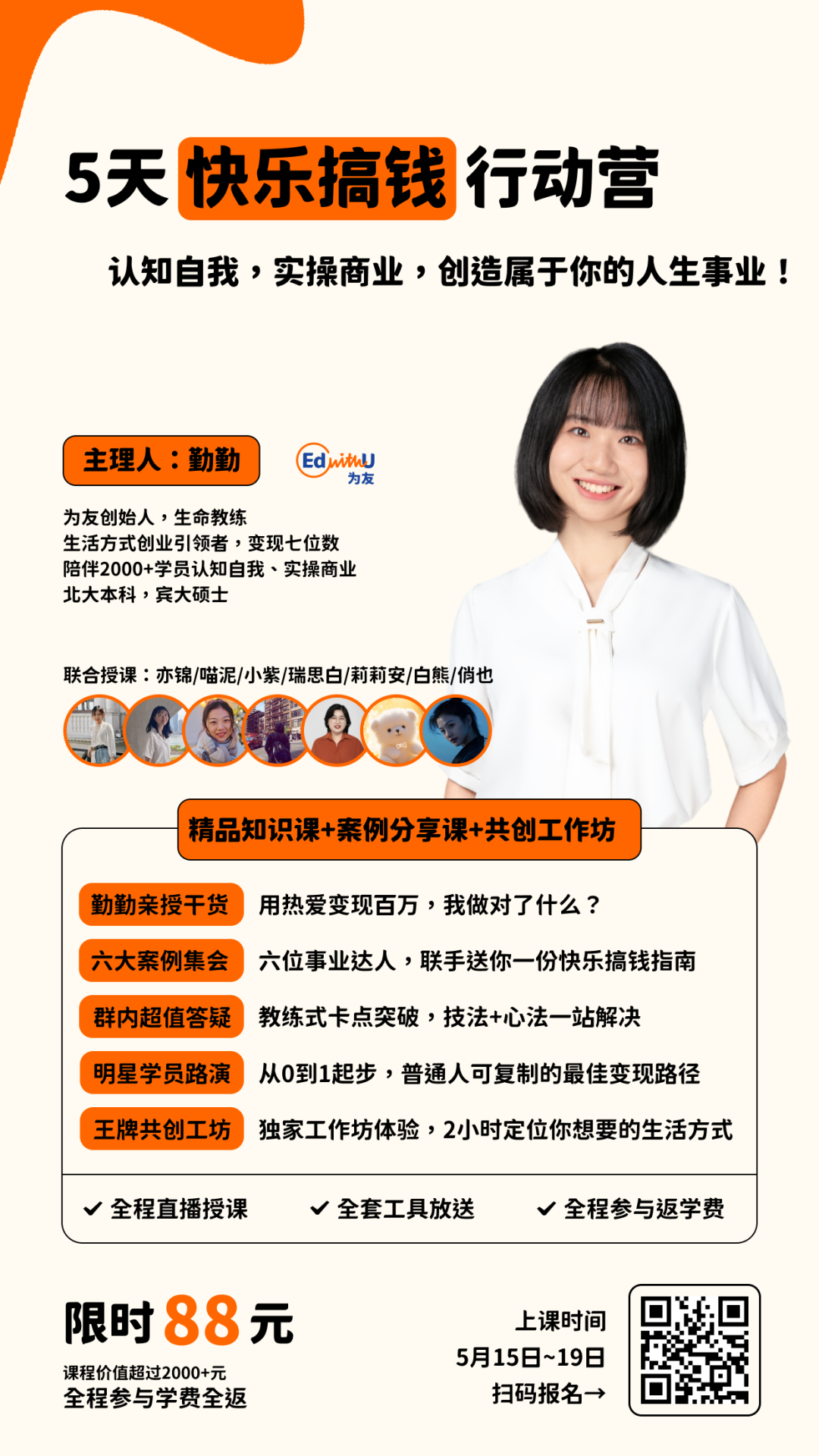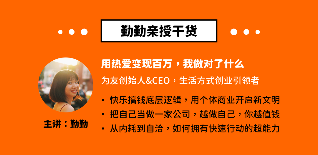 向内专注,我们有勤勤亲授百万创业干货,赋能你从心力到技法一站式升级。还有独家个人探索工作坊,让每个人都能沉浸式参与共创互动,带你认清你的赚钱通路。