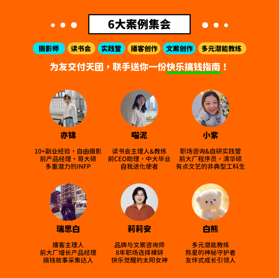 事业涵盖:摄影师、读书会、实践营、播客创作、文案创作、潜能教练