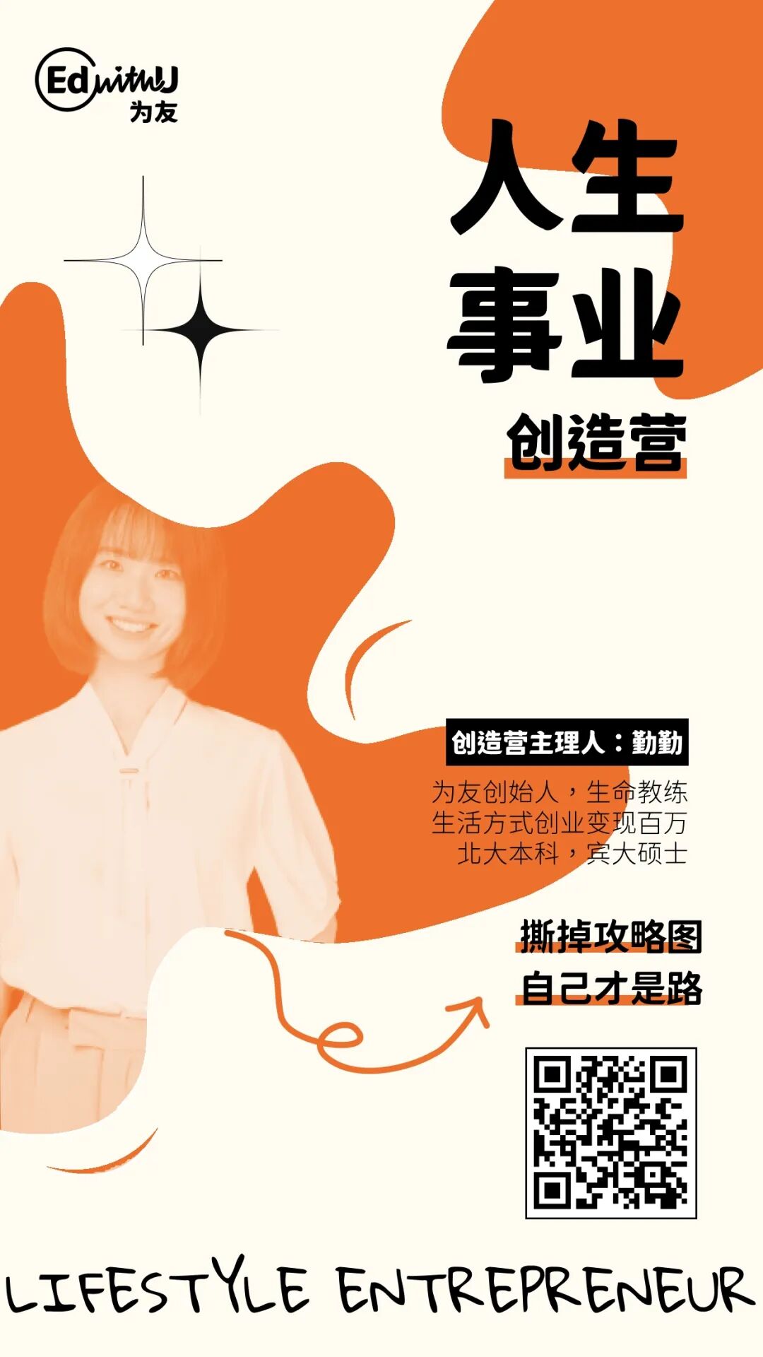 为友的场域,能量太强大了,我链接到更广阔的圈子,小伙伴们超级优秀,让我看到“人生的一百种活法”。以终为始,开启一些改变的契机,如持续不断的自我探索、商业实操方面的入门、时间精力管理等长期主义受用的知识。人生事业创造营整个过程体验感太好了,感觉像是打通任督二脉。