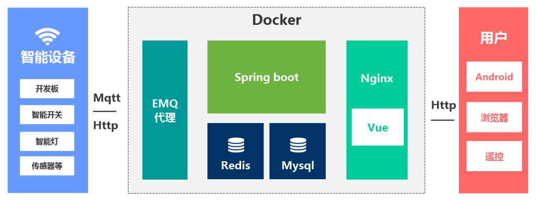 其中软硬件交互基于 Mqtt 协议和 Http 协议,使用 EMQ 代理服务器。