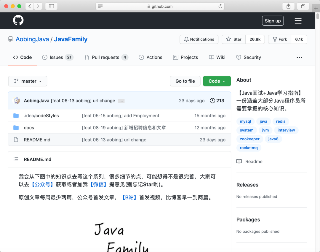 Guide 哥是 Java 领域比较知名的博主,他开源的 Java 面试指导项目斩获 100K + 的 Star。这是一份涵盖大部分 Java 程序员所需要掌握的核心知识。如果你最近在准备 Java 面试,不知道如何下手,请试一试 JavaGuide 吧。