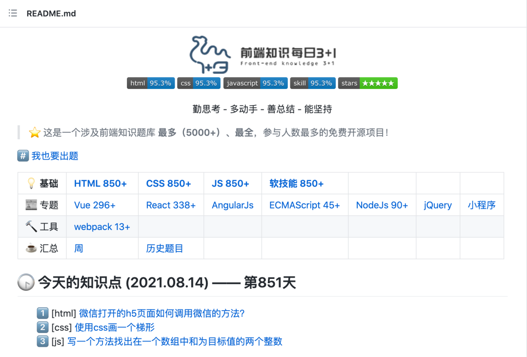这个仓库太牛了,每天早上 5 点会纯手工发布面试题,截至目前已经坚持了 850 多天。