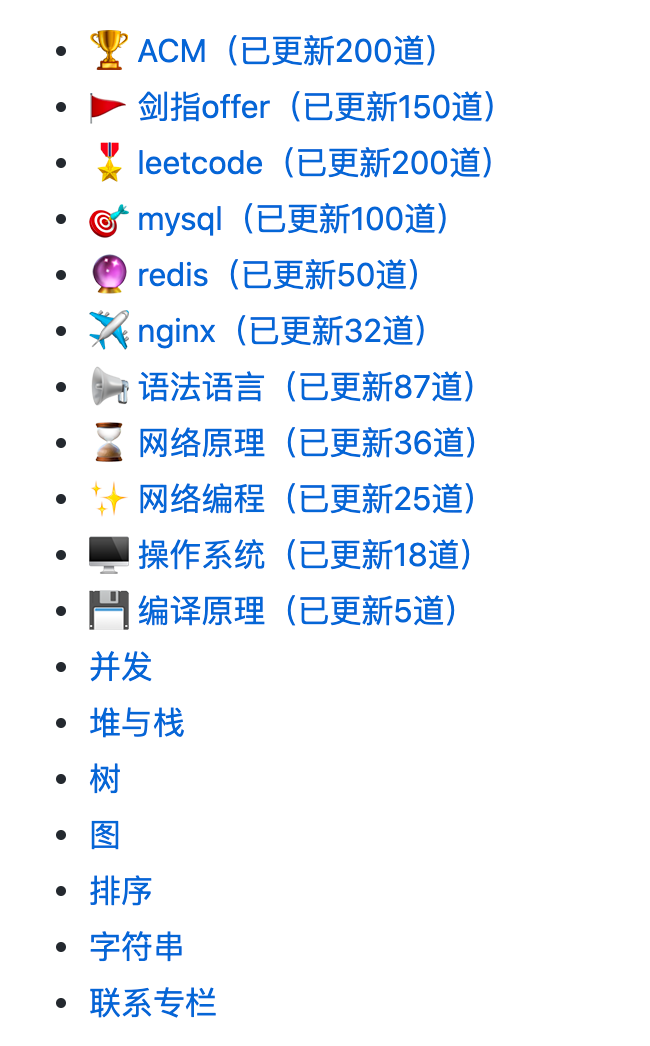 技术面试必备基础知识、Leetcode、计算机操作系统、计算机网络、系统设计、Java、Python、C++。